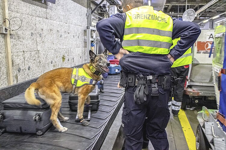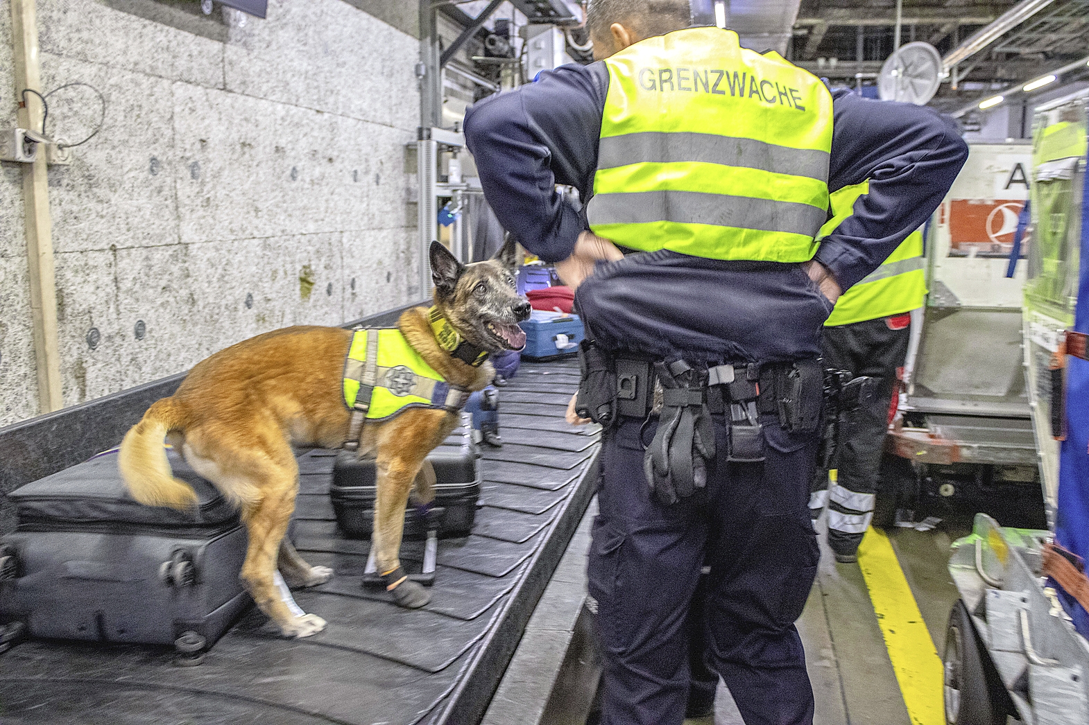 den grünen Ausgang mit der Aufschrift «Nichts zu verzollen». Viele Reisende wollen einfach nur hinaus, vielleicht warten draussen Freunde und Familien. Finja lässt das kalt. Die 11‑jährige Diensthündin arbeitet konzentriert. Sie ist ein belgischer Schäferhund, ein sogenannter Malinois, mit rötlichbraunem Fell. Unter Anleitung ihres Diensthundeführers wird sie von Person zu Person geführt, von Gepäckstück zu Gepäckstück. Für jede Kontrolle braucht sie nur wenige Sekunden, meist fünf, allerhöchstens zehn.