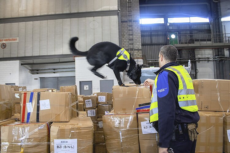 Der letzte Trainingsposten führt in die Cargo-Logistik. Überall liegen Kartonpakete, die übereinandergestapelt sind, irgendwo dazwischen befindet sich ein kleines Paket mit Betäubungsmitteln – auch dieses wurde vorgängig von BAZG-Mitarbeitenden für das Diensthundetraining präpariert und platziert. Hier arbeitet Haze. Auch er ist ein deutscher Schäferhund. Der Hundeführer prüft zuerst, ob der Untergrund stabil ist. Dann springt Haze auf den rund anderthalb Meter hohen Stapel, hält das Gleichgewicht und schnüffelt weiter. Nach wenigen Sekunden zeigt er wiederum an. Nach mehreren Durchgängen ist dann Mittagspause.