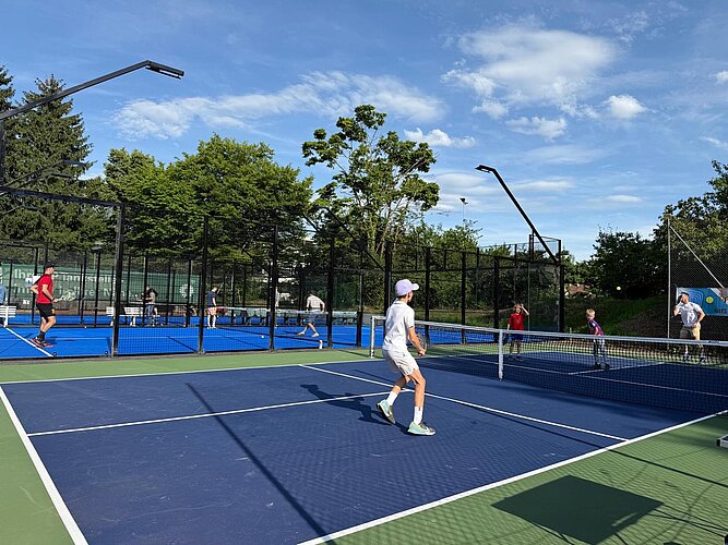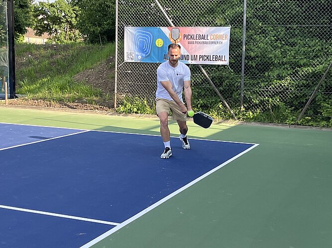 Nach dem symbolischen Banddurchschnitt wurden die neuen Plätze freigegeben. Wer wollte, konnte Padel oder Pickleball gleich selbst ausprobieren. Leihschläger, Betreuung und motivierte Mitspielende standen zur Verfügung. Ein kleines Highlight war die Möglichkeit, gegen den Schweizer Nr. 3 im Pickleball, Dominik Kuhn, ein paar Bälle zu schlagen.