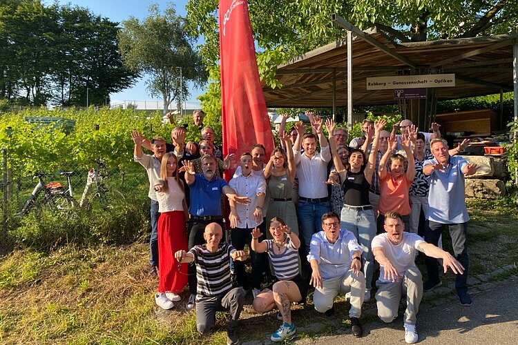 Wiederum feierlich vorbereitet und eingedeckt wurde die Pergola der Rebberggenossenschaft Opfikon am Donnerstag, 27. Juni, von Lieta Studer und Rebekka Bührer. Um 18 Uhr konnte der gut gelaunte und stolze Präsident von Gewerbe Stadt Opfikon, Stefan Jenny, rund 30 Gewerblerinnen und Gewerbler bei schönstem Wetter im feierlichen Ambiente begrüssen. Er erwähnte, dass der Vorstand eine arbeitsintensive Zeit hinter sich hatte, da der Verein neu aufgestellt wurde und sich ab jetzt viel dynamischer präsentieren werde. Das neue Logo stellte er auf der mitgebrachten Beach Flag vor, unter der sich dann alle Anwesenden fröhlich winkend präsentieren konnten.