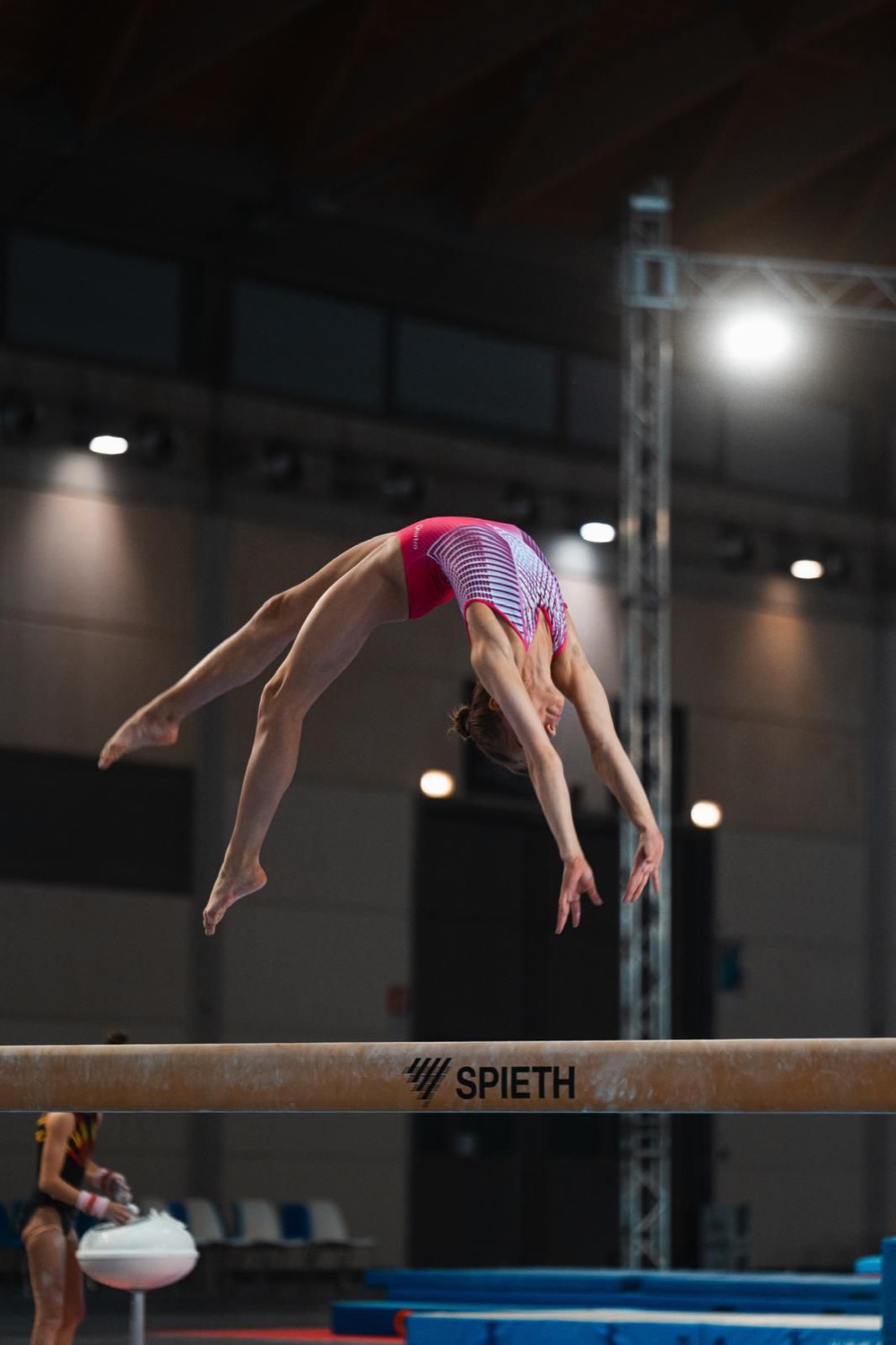 Am frühen Morgen des 3. Mai war es dann so weit: Die Juniorinnen-EM begann! Das Schweizer Team wurde dem Publikum feierlich vorgestellt und ging am Stufenbarren an den Start. Matilda Pohl aus Wallisellen, die dem Turnverein Opfikon angehört, war die allererste Turnerin. Der Start glückte ihr und die Übergänge vom oberen zum unteren Holm und wieder zurück (Schaposchnikova/Paksalto) funktionierten sehr gut. Leider schlug Matilda nach dem Griffwechsel in der Riesenfelge mit einem Fuss am unteren Holm an, was ihr den Schwung nahm, so dass sie mit einem Sturz vom Gerät ging. Sie erreichte 9,46 Punkte, die in die Teamwertung einflossen und ihre spätere Platzierung festigten.
