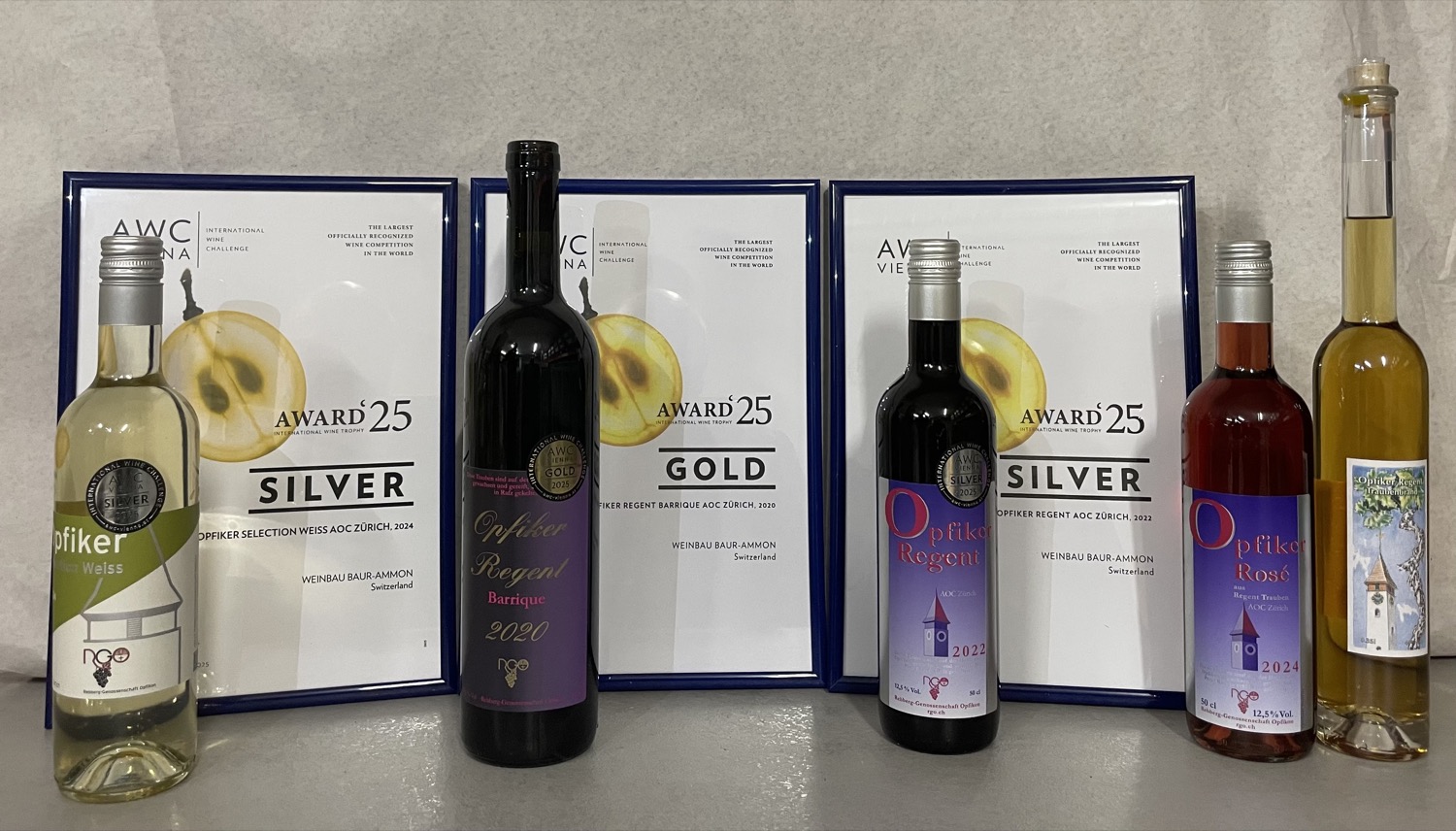 Der Austrian Wine Challenge (AWC) gilt als einer der renommiertesten weltweiten Weinwettbewerbe. Die Fachjury setzte sich aus gut 300 internationalen Expertinnen und Experten zusammen und hatte dieses Jahr Weine aus 21 Nationen zu bewerten. Von der Rebberg-Genossenschaft Opfikon (RGO) wurden die beiden Rotweine Barrique 2020 und Regent 2022 sowie die neu produzierte Selection Weiss 2024 eingereicht.