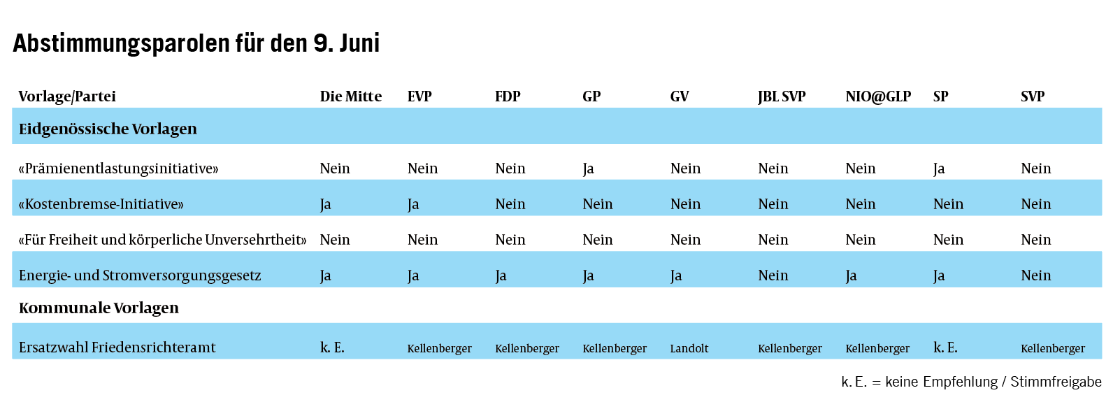 Die Parteien haben ihre Abstimmungsempfehlungen beschlossen, bevor Michel Landolt seine Kandidatur für das Friedensrichteramt zurückgezogen hat. Er steht nun nicht mehr zur Verfügung. Siehe Artikel.