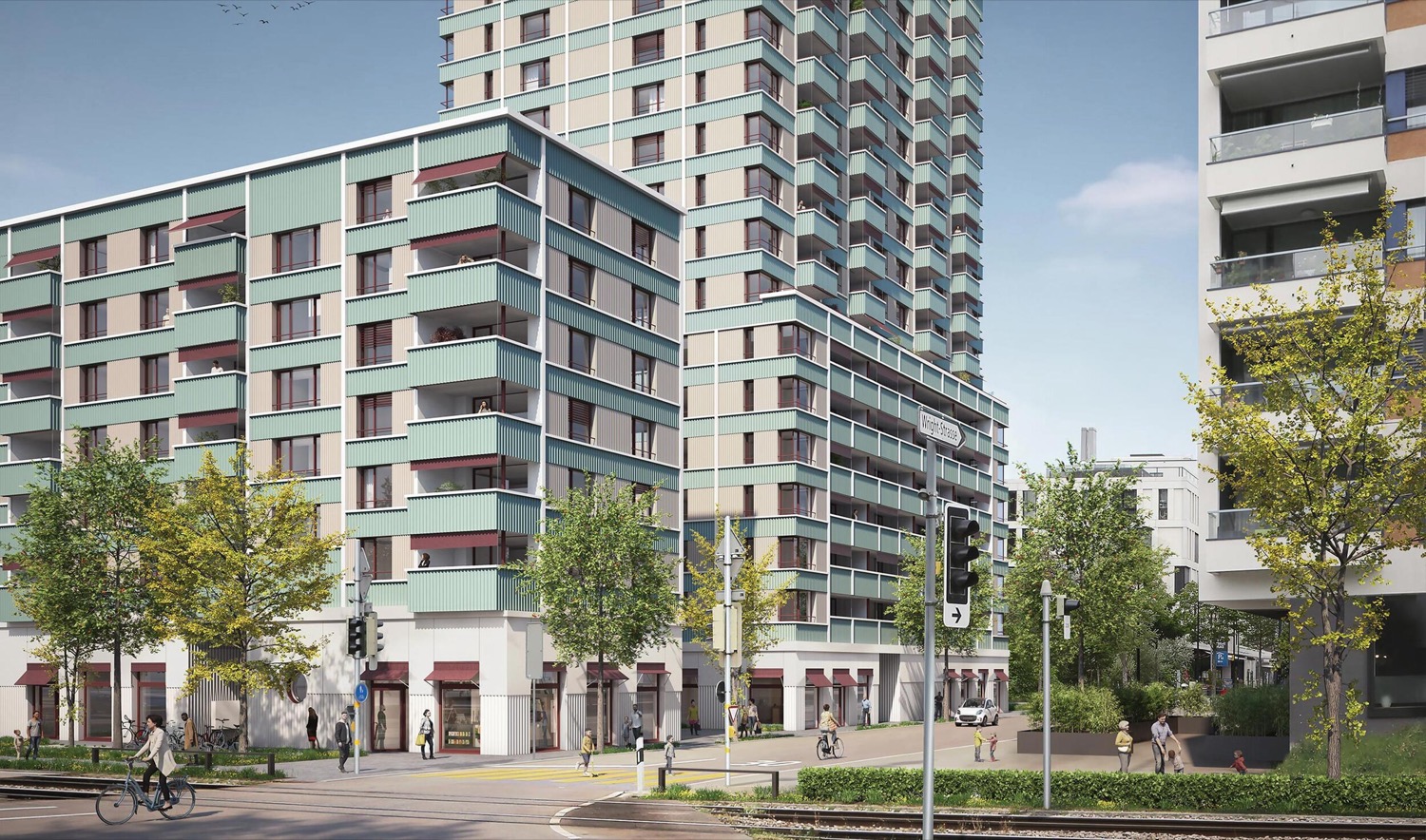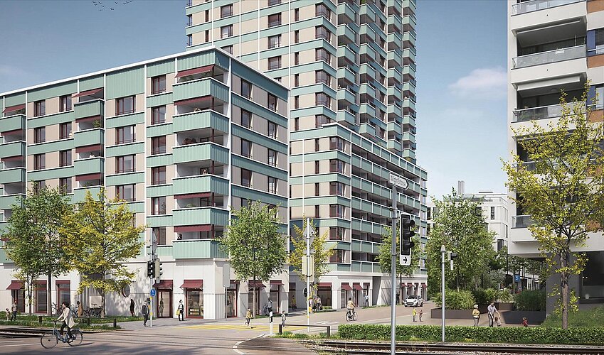 Direkt an der Thurgauerstrasse hingegen, wo sich die Tramhaltestelle Glattpark befindet, ist ein kleiner Park geplant – während alle anderen Gebäude auf dieser Seite bewusst keine lärmempfindlichen Wohnungen enthalten dürfen. «Das Grundstück liegt am Ortseingang Opfikon und grenzt an die Stadt Zürich», heisst es bei der Stadt auf die Frage, warum von diesem Lärmschutzkonzept abgewichen wird. Die Strassen und die Haltestellen im Bereich Glattpark bildeten einen sichtbaren Übergang zwischen den beiden Städten. «Bereits seit längerem besteht der Wunsch nach einer qualitätsvollen Platzgestaltung. Das Siegerprojekt nimmt diesen Gedanken auf und ordnet die Gebäude zurückversetzt an.» Dadurch entstehe Raum mit Aufenthaltsqualität. Das Projekt entspreche den geltenden Nutzungsvorgaben. Die maximal zulässigen Kennwerte – etwa die maximale Ausnützungsziffer von 253 Prozent – würden eingehalten, liessen aber wie bei jedem Bauvorhaben innerhalb dieses Rahmens einen gewissen Spielraum zu. Dieser werde jedoch durch weitere Anforderungen präzise begrenzt, etwa die Einhaltung der Lärmgrenzwerte für Wohn- und Schlafräume – auch im weiter von der Thurgauerstrasse entfernten Teil.