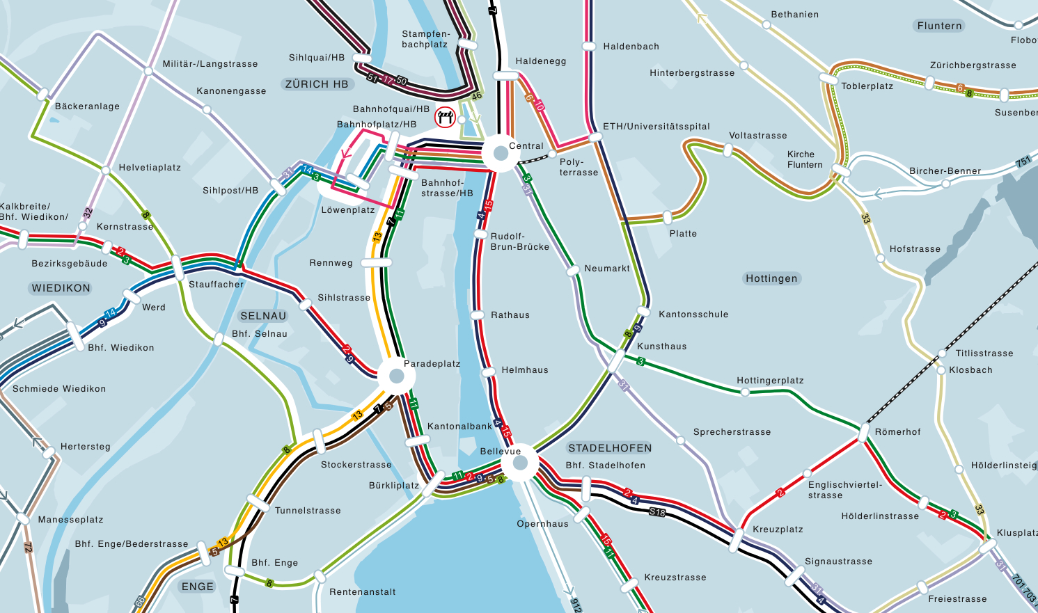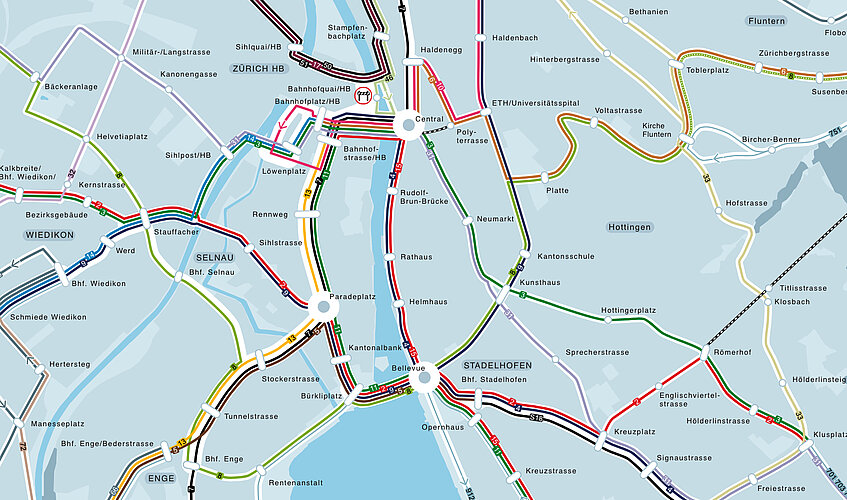 Ganz anders die Verkehrsbetriebe Zürich VBZ: Sie setzen das «Tramnetz Süd» mit mehr Trams vom Bellevue und Stadelhofen zu den Spitälern am Balgrist um und passen die Tramlinien rund um den Hauptbahnhof an, weil die Haltestelle Bahnhofquai behindertengerecht umgebaut wird. Es ist die grösste Umstellung in der Geschichte des fast 130-jährigen Unternehmens. Betroffen sind die Tramlinien 4, 5, 6, 11, 13, 14 und 17, die während der Bauzeit angepasst verkehren. Ausserdem verbinden die neuen, befristeten Tramlinien 50 und 51 den HB mit den nördlichen Stadtquartieren.