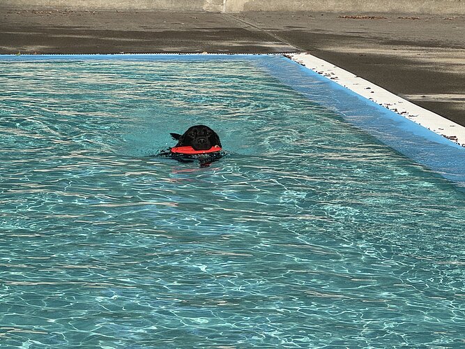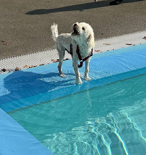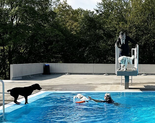 Das Wetter war perfekt für den Anlass, sonnig, aber nicht zu heiss. Den ganzen Tag hindurch herrschte im Freibad Grossbetrieb. Während die einen Hunde auf der Wiese herumtollten und spielten, sprangen andere mutig ins Wasser und apportierten den von Herrchen oder Frauchen geworfenen Ball. Andere wiederum standen zögernd am Rand und wagten den entscheidenden Schritt ins tiefe Wasser nicht oder nur mit gutem Zureden. Die ganz Mutigen sprangen vom 1‑Meter-Sprungbrett in den Pool oder glitten die Rutschbahn hinunter, was mitunter zu Schwierigkeiten führte, zum Beispiel wenn sie über die Rutschbahn zu ihren Besitzern zurückkehren wollten, was natürlich kläglich misslang, oder wenn sie es im Becken nicht schafften, sich auf die Mauer hochzuziehen.