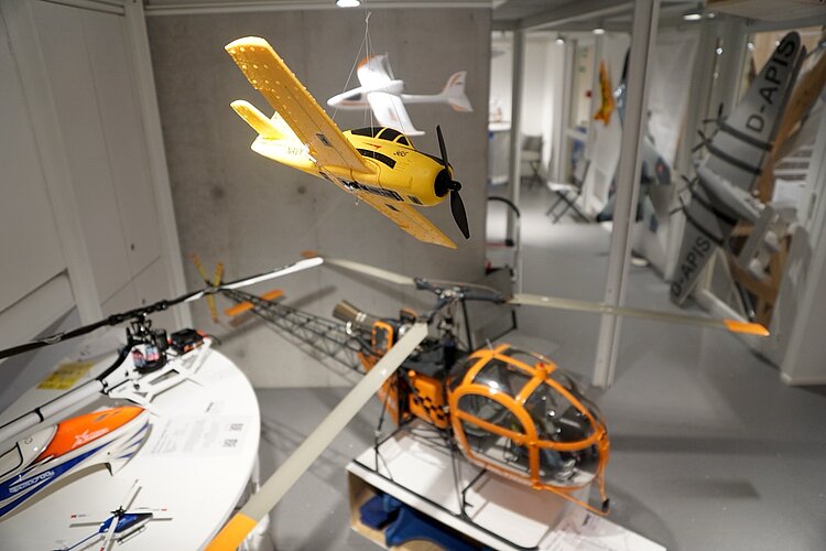 Gebaut sind sie eigentlich gar nicht für die Galerie, sondern für die frische Luft: Es sind Fluggeräte in allen möglichen Formen, welche die rund 80 aktiven Mitglieder des Modellflugvereins Bassersdorf noch bis am 29. Januar hier zeigen. Ein grösserer Teil stammt vom Opfiker Dominik Escher. Er baut Flächenflugzeuge (also keine Helikopter) in verschiedenen Bauweisen und allen Grössen. Das kleinste hat komplett auf seiner Hand Platz und lässt sich dank der Miniaturisierung der Technik tatsächlich antreiben und fernsteuern.