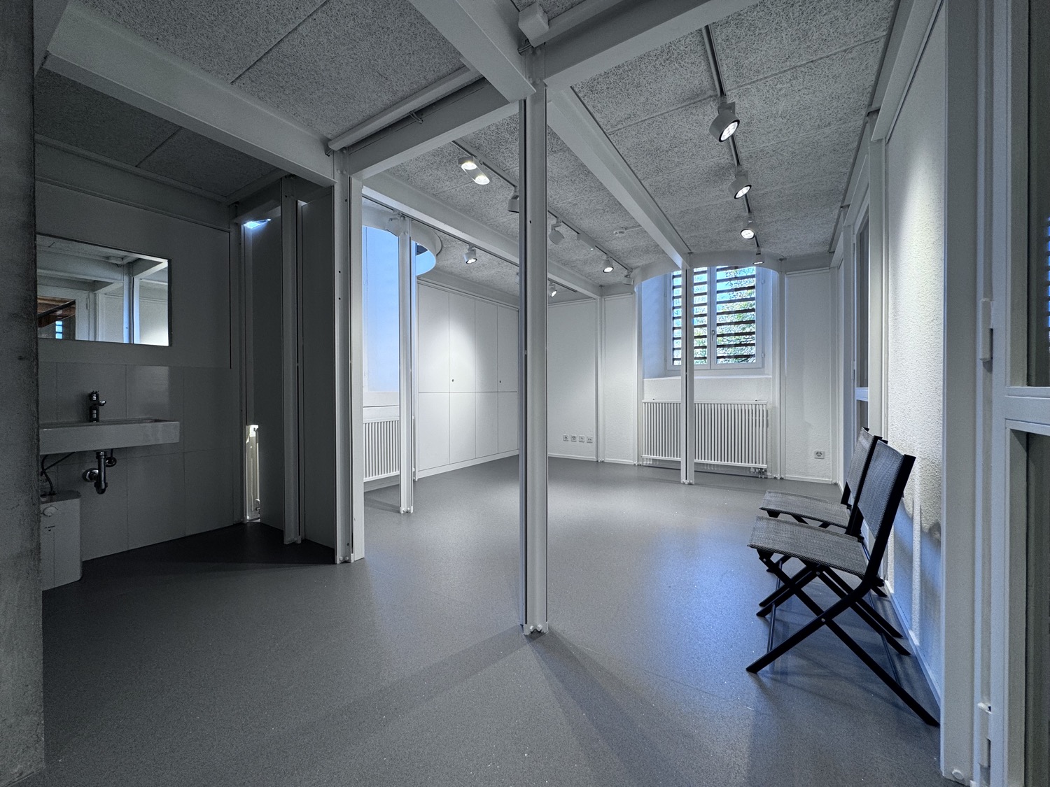 Die Galerie selbst erfuhr wenig Änderungen: Selbst die «Spaghetti-Platten» (Dämmplatten aus Holzfasern als Deckenverkleidung) wurden wiederverwendet. Auch das Erdgeschoss der Galerie wurde sanft erneuert: Der Boden, bestehend aus eng aneinandergelegten Stirnholzparkett-Klötzen, wurde abgeschliffen und geölt; ersetzte Teile sind aus etwas hellerem Holz. «Das darf man ruhig sehen», findet Architekt Mario D’Alberto. Neu ist die kleine Küche, welche es erlaubt, hier etwa Vernissagen-Apéros zuzubereiten, und das IV-gerechte WC. Auf der Bergseite des Tenns führt eine bestehende Tür in den Korridor, der seinerseits das «Beizli» erschliesst. Auch dort hat sich auf den ersten Blick wenig verändert. Die bereits erwähnten Lampen leuchten aber wahlweise nach unten, oben oder beides – was den Charakter des Raumes mit den rohen Steinwänden besonders betont.