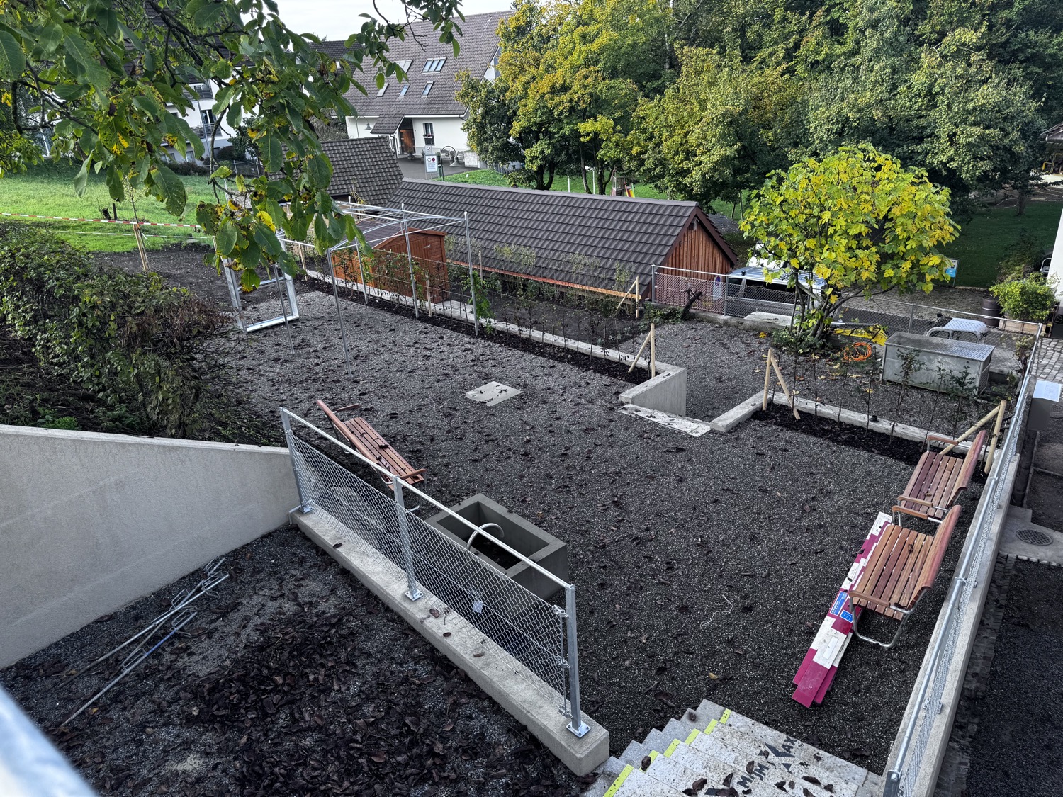 Im Garten hinter dem Haus hat sich einiges getan: Die zwei bröckelnden Stützmauern auf dem abschüssigen Gelände wurden durch neue aus Beton ersetzt. Der Garten besteht somit neu aus zwei begehbaren Terrassen, die durch besagte Mauern sowie einen begrünten Sicherheitszaun voneinander getrennt sind. Eine kleine Treppe verbindet die beiden Ebenen direkt miteinander. An Gestaltungselementen findet man einen Brunnen und eine Pergola, ein Feuerholzlager und eine Feuerschale kommen demnächst hinzu. Drei Bänke bieten feste Sitzgelegenheiten.