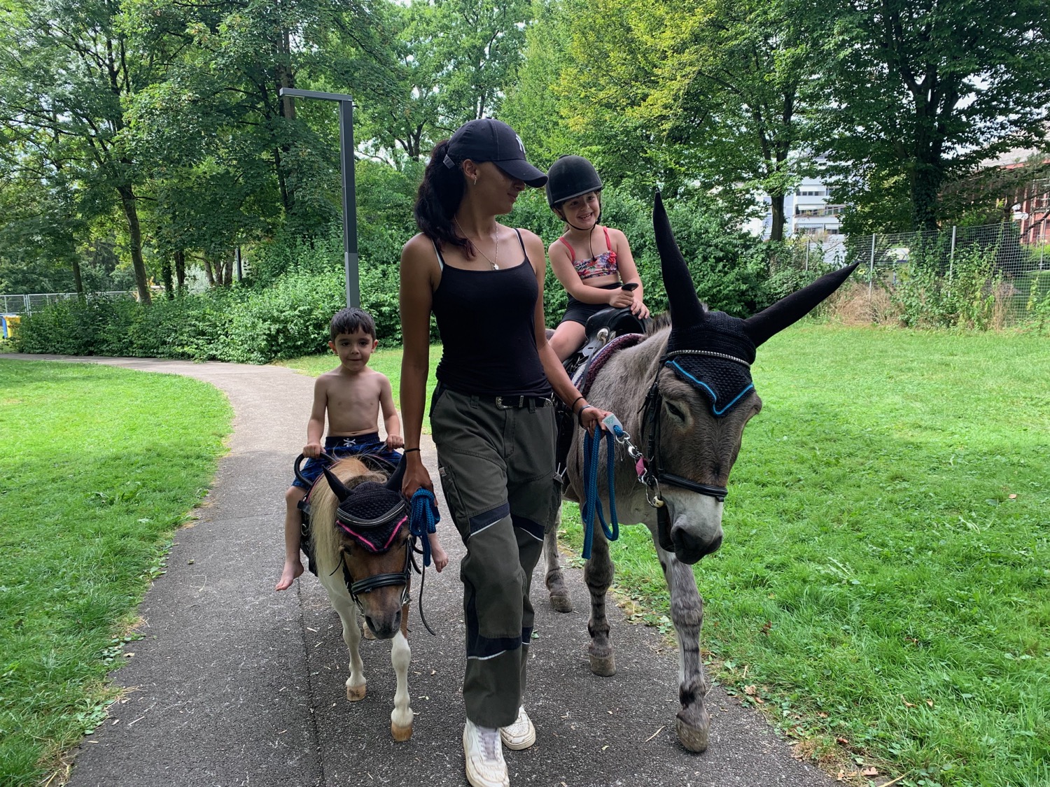 Inzwischen sind die 7-jährige Shqipe und der 4-jährige Arcan vom «Ausritt» auf den Eseln zurückgekehrt – und begeistert: Sie wollen nachher auch noch mit den Pferden eine Runde drehen. Vorerst wartet aber noch ein knappes Dutzend anderer Kinder auf diese Gelegenheit. Um die Tiere zwischendurch etwas zu schonen, lösen sich Esel und Pferde nämlich ab – was von einigen wartenden Kindern mehr Geduld erfordert, als diese aufbringen können.