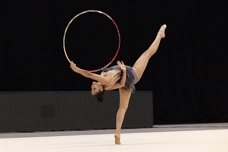 Regelrecht Medaillen gesammelt hat Karyna Frolova. Die 15-Jährige gewann den Mehrkampf Juniors P5, der aus je einer Übung mit den Handgeräten Reif, Ball, Keulen und Band besteht sowie vier Medaillen in den Gerätefinals (Gold Keulen, Silber Ball und Reif sowie Bronze mit dem Ball). Sie liebt alle Handgeräte, am meisten Ball. «Es ist das erste Handgerät, mit welchem ich eine Kür zeigen durfte», erklärt sie. Das beliebte Spielgerät ist allerdings in der RG nicht als einfach zu bezeichnen. Der Ball darf nie gegriffen werden und kann daher leicht wegrollen. Frolova beeindruckt, zum Song «Halleluja» schwebt sie über den Teppich und lässt dabei den Ball über den Boden und ihren Körper rollen, wirft ihn hoch in die Luft und fängt ihn hinter dem Körper ohne Blickkontakt auf.