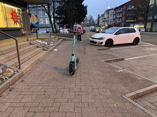 Die einfach per App ausleihbaren E-Trottis werden oft achtlos mitten auf Gehwegen und Trottoirs abgestellt. Die Stadt Opfikon hat deshalb anfangs Jahr versuchsweise offizielle Parkplätze dafür beschildert. Am 1. Januar ist nun ein neues Reglement in Kraft getreten. Demnach ist das freie Parkieren in gewissen Gebieten untersagt. (rs.) Bild Roger Suter