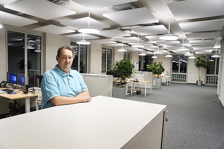 Während das «Erdgeschoss» des Erweiterungsbaues als gedeckter Parkplatz dient (der aber bei Bedarf dem Innenraum zugeschlagen werden könnte), wird der 1. Stock nun vom Steueramt genutzt, das vom bestehenden Gebäude hierher umgezogen ist. Gearbeitet wird hier nach wie vor im Grossraumbüro – auch auf Wunsch der Mitarbeitenden, wie Martin Pfenninger, Leiter des Steueramts, erklärt. Zwei abgetrennte Schalter garantieren die notwendige Diskretion.