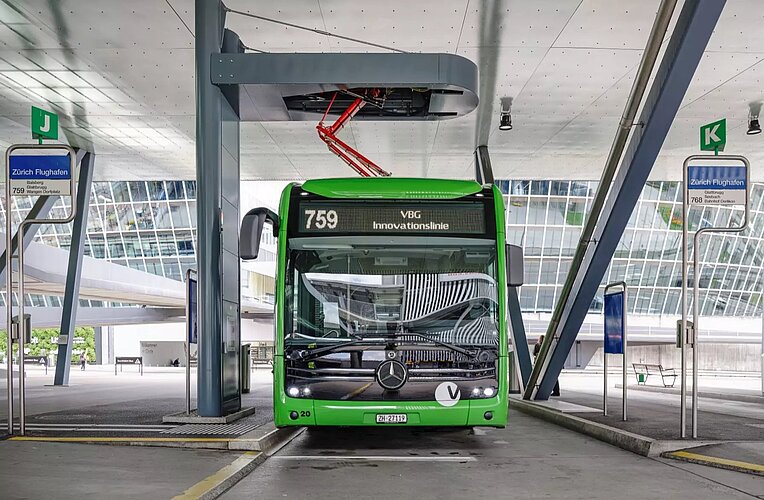 Vergangene Woche fuhren die grünen Elektrobusse nicht auf ihrer Stammlinie 759 von Wangen zum Flughafen. Es gab Probleme mit dem Lademast.