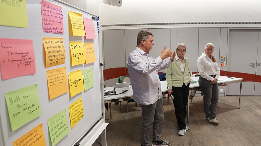 Nach vielen Informationen über die drei Kirchgemeinden formulierten die Besucherinnen und Besucher in der Pause ihre Fragen, Wünsche und Befürchtungen und hefteten sie an die entsprechenden Tafeln. Moderator und Berater Peter Gysel reichte sie danach an die drei Kirchenoberhäupter weiter.