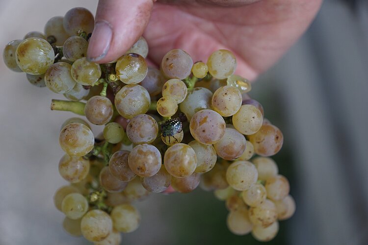 Doch die Trauben der verschiedenen Sorten waren an jenem Freitag von guter Qualität und Reife, erkennbar an den bräunlichen statt grünen Kernen darin. Insgesamt wurden von den neuen weissen Trauben 460 Kilo geerntet (Vorjahr: 60), davon knapp 200 Kilo Muscaris sowie je 130 Kilo Divona und Souvignier gris (die eher rosa aussehen). Diese Neuzüchtungen sind gegenüber Pilzen besonders widerstandsfähig (sogenannte Piwi-Sorten) und brauchen entsprechend weniger Spritzmittel – was sowohl Umwelt als auch Geldbeutel schont. Souvignier gris, Divona und Muscaris sollen zusammen eine neue Cuvée «Opfiker Weiss» bilden.