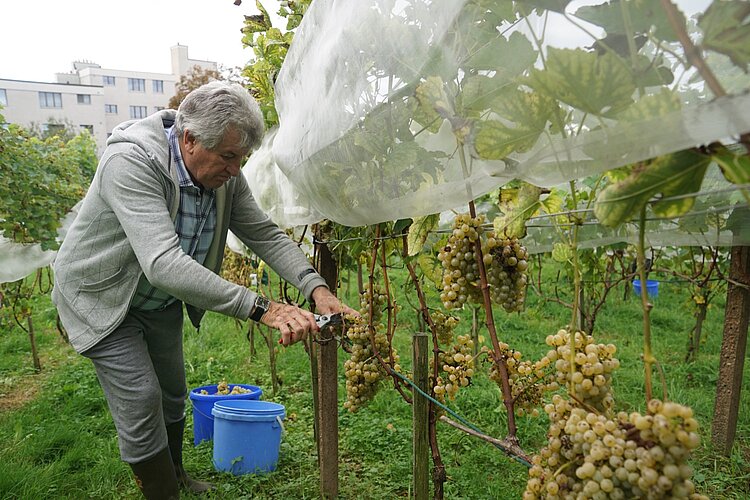 Um für diesen Prozess das optimale Ausgangsprodukt zu liefern, waren am Freitagmorgen ein gutes Dutzend Mitglieder der Rebbergenossenschaft Opfikon (RGO) angetreten, bewehrt mit Kesseln und Reb- oder Gartenscheren. Das Wetterglück war dabei kein Zufall: Brunner hatte absichtlich und für RGO-Verhältnisse kurzfristig zum Wümmet zwischen zwei angesagten Regentagen geladen. «Die Erfahrung zeigt, dass die Trauben nach Niederschlägen aufplatzen können», so der erfahrene Rebbauer, der auch privat einen Weinberg pflegt.