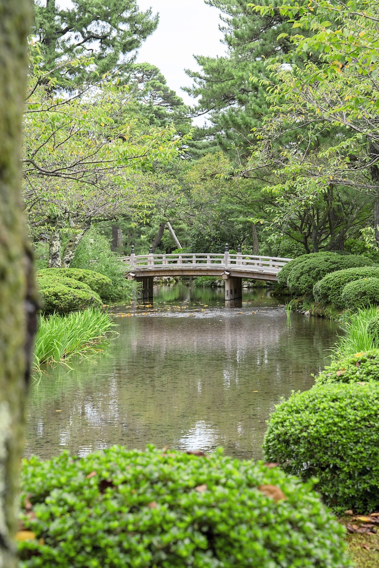 Direkt nebenan liegt der Kenrokuen-Garten, einer der drei schönsten Landschaftsgärten Japans. Der Name bedeutet «Garten der sechs Erhabenheiten» und bezieht sich auf Landschaftsattribute wie Weitläufigkeit, Wasserreichtum und Aussicht. Angelegt wurde er über einen Zeitraum von fast 200 Jahren.