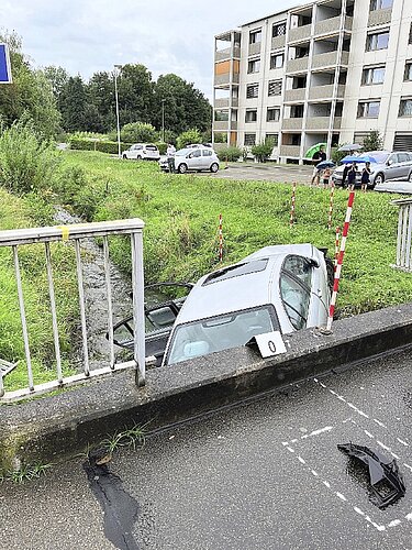 Wie die Polizei mitteilt, fiel gegen 14.10 Uhr einer Patrouille im Zentrum von Bassersdorf ein mit zwei Personen besetztes Auto auf. Als der Lenker bemerkte, dass ihm die Polizei folgt, beschleunigte er und fuhr mit massiv übersetzter Geschwindigkeit auf der Bahnhofstrasse Richtung Bahnhof. Die Polizei folgte den Flüchtenden mit eingeschalteten Warnsignalen. Kurz vor der Linkskurve beim Bahnhof bog der Flüchtende abrupt rechts in den Auenring ein, wo ein anderes Auto hinausfahren wollte. Das Fluchtfahrzeug durchbrach in der Folge ein Brückengeländer und kam im Auenbach zum Stillstand.