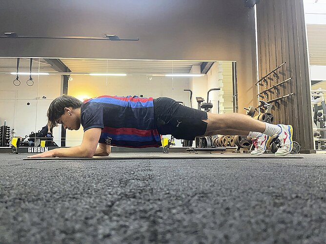 Die Plank trainiert viele Muskeln. Gehe in Bauchlage, stütze dich auf Unterarmen und Fussspitzen ab, sodass der Körper eine Linie bildet. Wichtig: Das Gesäss sollte weder zu hoch noch zu tief sein. Halte die Position so lange wie möglich.