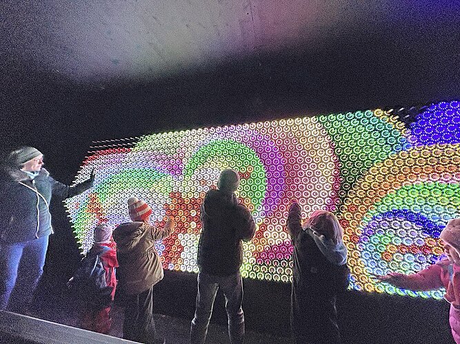 Musikalisch ruppiger geht es beim «House of Cards» zu und her, eine Lichtinstallation aus 128 leuchtenden Spielkarten, die sich in choreografierten Schichten zu einem Haus formen. Die Installation steht als Sinnbild für Mut, Vertrauen und Zusammenarbeit. In einem Linkedin-Beitrag fragen sich derweil die Zürcher Künstler, was denn gute Lichtkunst ist? «Partizipativ», meint einer, also Installationen, bei denen man mitmachen kann, und davon gibt es im Zauberpark verschiedene, beispielsweise «Quantum Jungle». Stösst man die Metallfedern an, so projizieren sie diese Berührungen in leuchtenden, flüssigen Farben auf eine grosse LED-Anzeige. Auch «Holi» , das mit einer eigens komponierten Tonspur unterlegt ist, verlangt eine Interaktion. Hier steht der Besucher buchstäblich im Mittelpunkt. Durch seine Bewegungen formen eine Million digitale Farbpartikel die Konturen der Betrachter und verbreiten so Freude und Farbe – in den bunten Holi-Fest-Farben natürlich, wie die portugiesischen Macher schreiben.