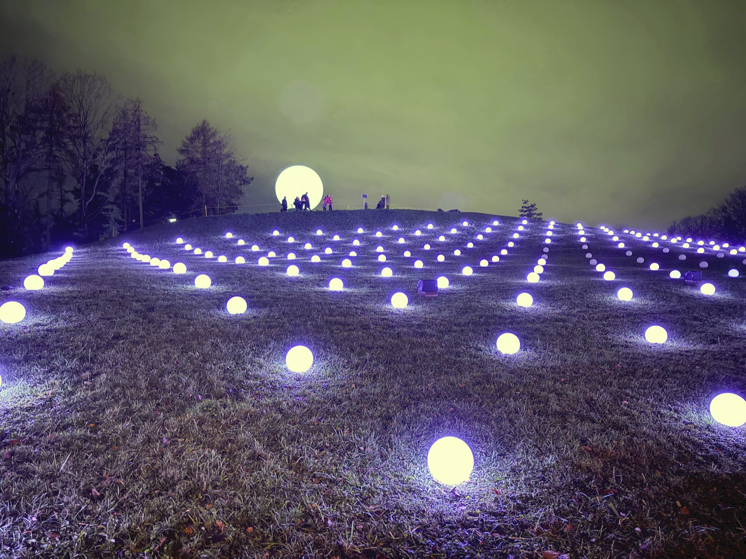 «Oh Tannenbär, oh Tannenbär, wie Müde macht die Kälte», so ist eine etwas kreischende, beinahe unverständliche Stimme aus dem Wald zu hören. Sie stammt von sechs unterschiedlich grossen Schneefiguren, die sich in chaotischer Weise in ihre Lieblingstiere verwandeln und dabei ihre eigenen Interpretationen von bekannten Weihnachtsliedern singen. So wird Jingle Bells: «Jingle Bock, Jngle Bock, winterliches Glitzern, hab keinen Bock auf all den Weihnachtsstress und all die Lichterblitzer.» Die Lichtinstallation Frostorchester Schabernack des Zürcher Kreativteams Nachtlicht ist eine von 16 leuchtenden Kunstwerken, die derzeit auf dem Butzenbüel hinter dem «Circle» zu bestaunen sind. Es geht dabei nicht immer laut und hell zu und her, wie beim Frostorchester. Oft sind die Installationen mit leiser, harmonischer, fast psychedelische Musik unterlegt, die von irgendwoher aus einem Lautsprecher schallt.