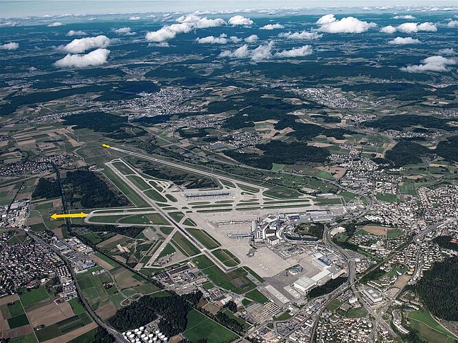 Der Flughafen kann sein Gesuch um Verlängerung der Pisten 28 (vorne) und 32 einreichen. Rechts befindet sich Kloten, unten Opfikon. Bild Flughafen Zürich AG