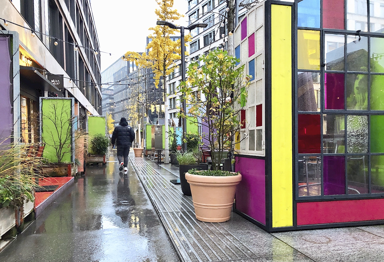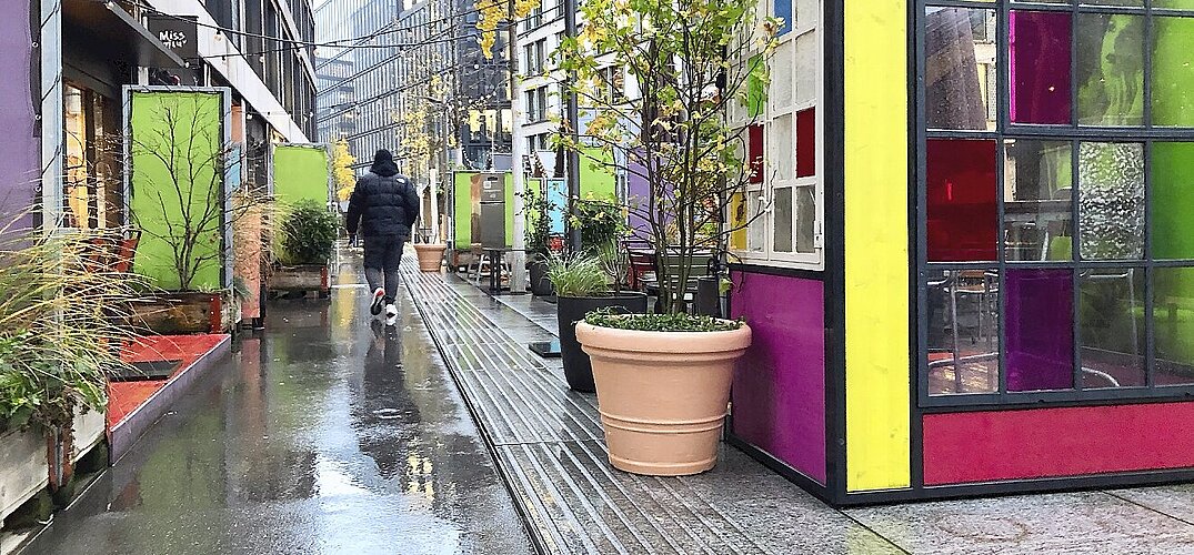 Ebenfalls ein Dauerzustand sind weiter vorne die pavillonartigen Kleinbauten, mit denen sich das Restaurant Miss Miu in den Strassenraum ausdehnt. Als das Bild links aufgenommen wurde, standen Pflanzentöpfe direkt auf dem Band. Dabei haben die Betreiber die Auflage, entlang der Führungselemente einen Gehbereich frei zu halten. Die Töpfe müssten entfernt werden, versichert Mathias Ninck; nach einem Hinweis durch die Stadtpolizei sei das auch bereits geschehen.