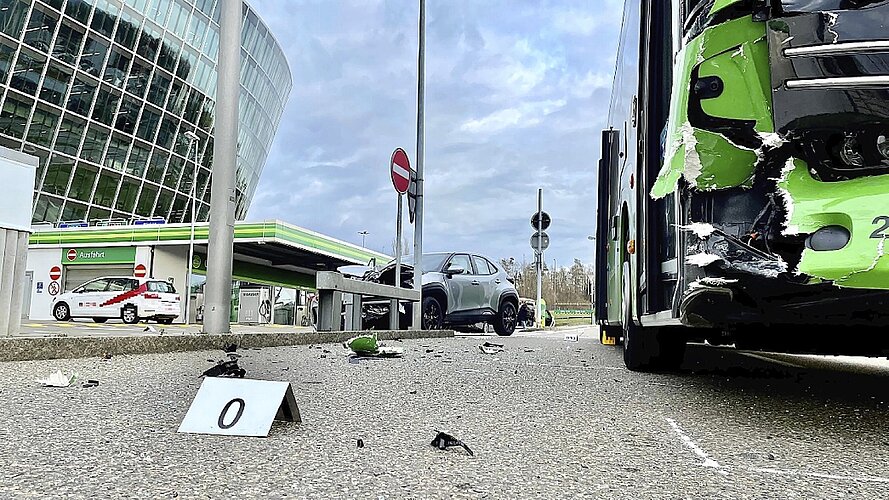 Nach Polizeiangaben fuhr gegen 14.30 Uhr eine 55-jährige Autofahrerin von einer Tankstellenausfahrt in die Flughafenstrasse ein. Dabei kam es aus noch nicht geklärten Gründen zur Kollision mit dem Linienbus, der in Richtung Flughafen – Bahnhof unterwegs war. Durch den heftigen Aufprall wurde eine 90-jährige Frau, die im Bus sass, schwer verletzt. Sie musste mit einem Rettungswagen in ein Spital gebracht werden. Die übrigen Fahrgäste im Bus sowie der Busfahrer blieben unverletzt. Die Autofahrerin und ihre Beifahrerin wurden zur Kontrolle in ein Spital gebracht.