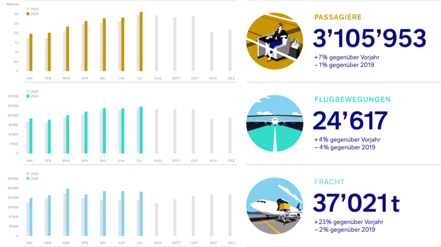 Die Anzahl Flugbewegungen stieg im Vergleich zum Vorjahresmonat um 4% auf 24 617 Starts oder Landungen. Der Monatsvergleich zeigt, dass die Flugbewegungen 96% des Niveaus von 2019 betragen. Die durchschnittliche Zahl Passagiere pro Flug lag mit 144 1% über dem Vorjahreswert. Die Sitzplatzauslastung ist im Berichtsmonat im Vergleich zum Vorjahresmonat um 1 Prozentpunkt auf 85% gestiegen.