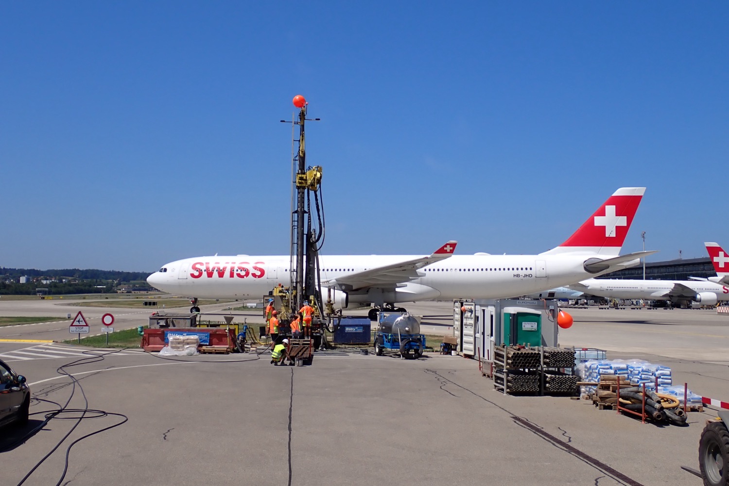 Die mehrstufige Erkundung der Rinne – eine Art wasser- und schotterführende Gletscherfurche unterhalb des Flughafengeländes – hat in den letzten zwei Jahren positive Erkenntnisse geliefert. In einem ersten Schritt wurden mittels seismischer Untersuchungen Tiefe, Form und Schichtaufbau der Rinne analysiert. Die im Anschluss durchgeführten Bohrungen an drei Standorten bestätigten die erste Analyse, dass die Rinne potenziell als Wärme- und Kältespeicher genutzt werden könnte.