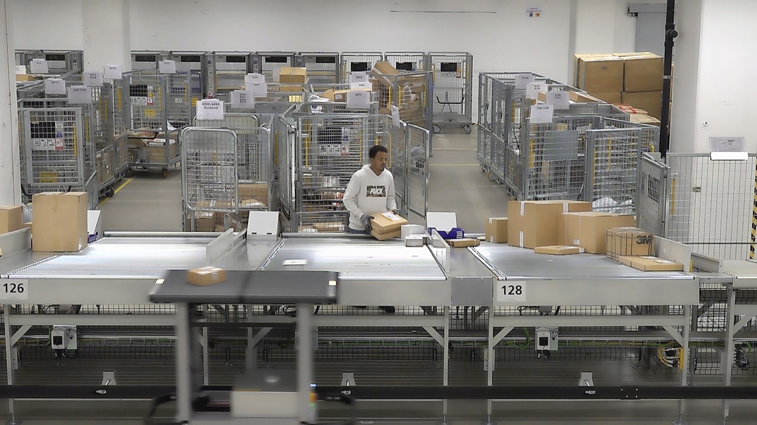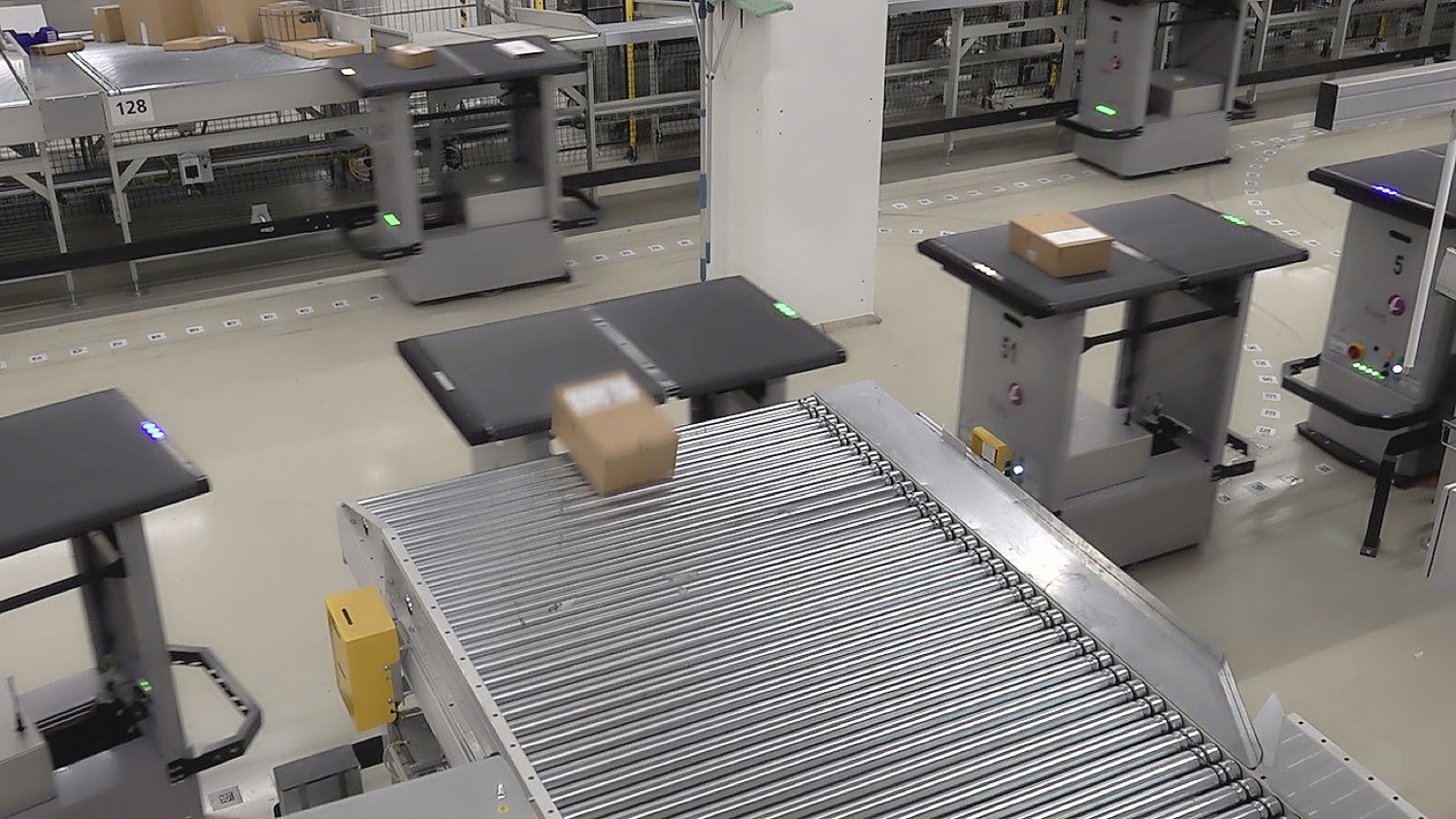 So haben zwei kleinere bis mittelgrosse Pakete auf einem dieser Roboter Platz, während grosse alleine unterwegs sind. Die eingelesenen Informationen werden auf den Roboter geladen, der dann das eingelesene Sortierziel zugewiesen erhält. Die Daten werden verknüpft und das Paket an der richtigen Endstelle wieder ausgeschleust, wo es nach der Postleitzahl sortiert wird. Hier übernehmen wieder Menschen das Beladen der Sortierwagen und der Lastwagen.