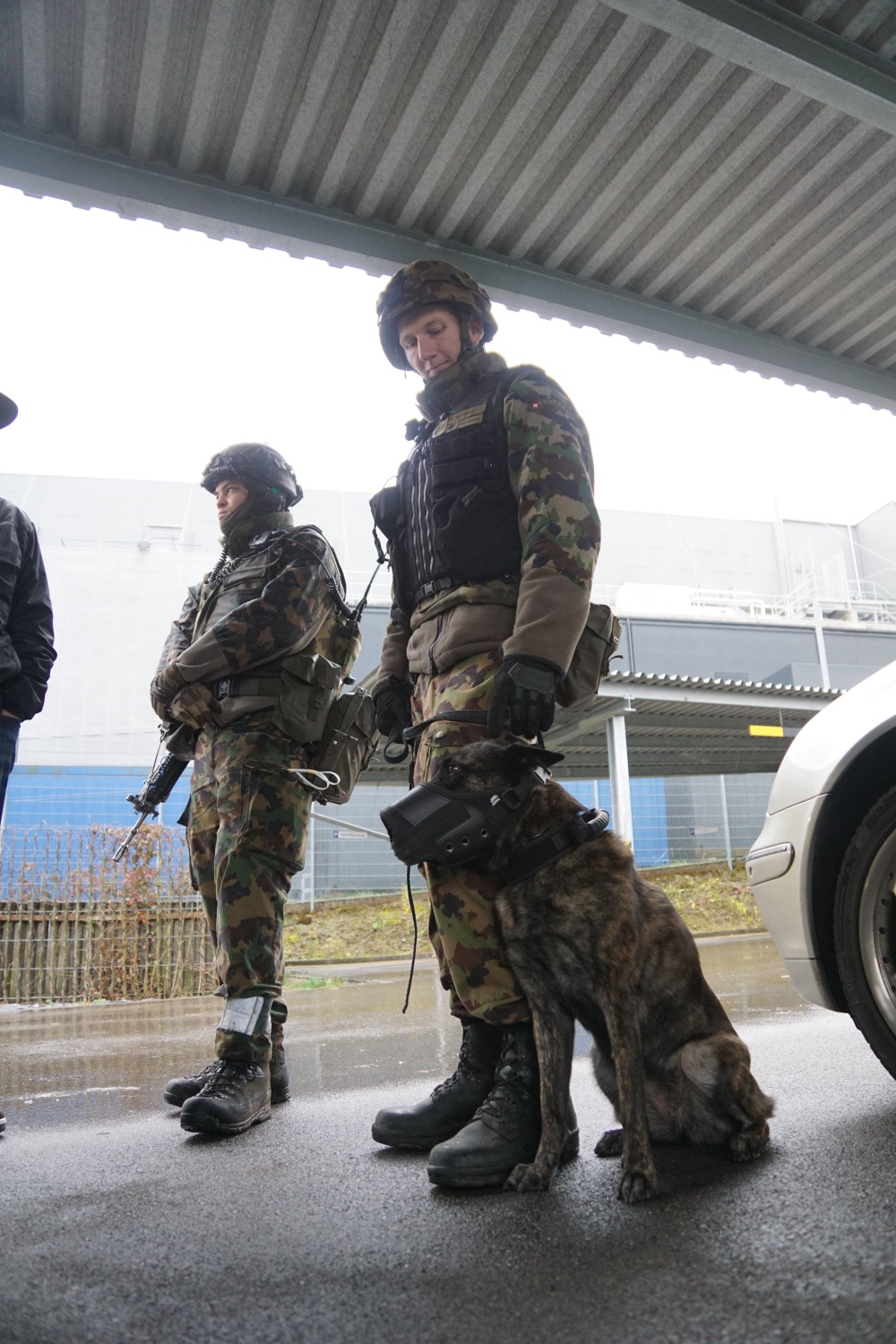 Die Soldaten, die bis am Mittwoch die Serverfarm in Glattbrugg bewacht haben, stehen nun in Rümlang im Einsatz. Auch hier steht ein solches Rechenzentrum. Im Schutz eines Parkplatzdaches spähen Soldaten auf die nahe Flughofstrasse. Zwei gepanzerte Mannschaftstransporter verengen die Zufahrt, zwei Kollegen überwachen sie; ihnen steht die 6-jährige Schutzhündin Osiris zur Seite. «Sie reagiert nicht nur auf Gerüche, sondern auch auf schnelle Bewegungen oder Geräusche, etwa von Metall», erläutert der Hundeführer an ihrer Seite. Das macht das Tier so intensiv, dass es nach einer halben Stunde abgelöst wird und Pause machen kann.
