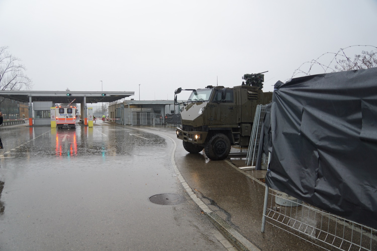 Als wichtige Infrastruktur wird auch der Flughafen beziehungsweise sein Zufahrtstor 130 Richtung Rümlang bewacht. Die Beobachtungsgeräte auf den gepanzerten und bewaffneten «Duros» bewegen sich leicht, weil sie den Waldrand beobachten.