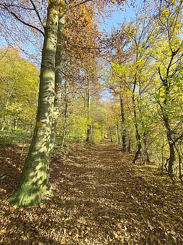 Waldweg beim Schluefweg mit Blick Richtung Swiss-Arena.