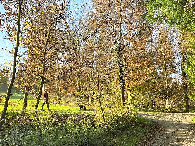 Der Hardwald zeigt sich in jenen Tagen von seiner buntesten Seite. Was man da nicht alles sieht: Ein Pferd trabt durch das tiefe Laub und wirbelt die Blätter vom Boden auf. Eine Familie flitzt mit ihren Velos über den Waldweg, ein Mann mit Cowboyhut schlendert mit seinem Hund dem Waldrand entlang oder eine Joggerin sprintet die Anhöhe hinauf.
