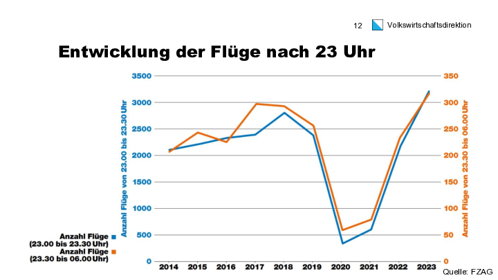 Weniger Freude bereitet dem Regierungsrat aber nach wie vor, dass 3500 dieser Flüge zwischen 23 und 6 Uhr stattfanden. 3181 davon durften bis 23 Uhr bewilligungsfrei Verspätungen abbauen, 300 erhielten eine Einzelbewilligung, um nach 23.30 Uhr zu starten. Lediglich 5 hat das zuständige kantonale Amt für Mobilität wegen eines möglichen Verstosses nach Bern gemeldet.