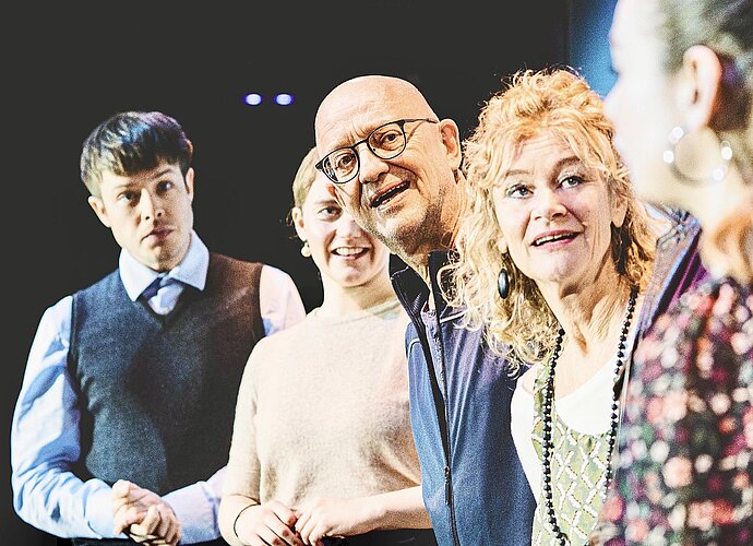Während die erste Hälfte der von Daniel Rohr inszenierten Komödie noch wesentlich vom dynamischen Spiel Hanna Scheurings (als Anne), László Kishs (Eddi) und vor allem Klaus Hemmerles (Johannes) getragen wird, dramaturgisch aber in die immer gleiche Richtung zielt, nimmt die Aufführung nach der Pause ordentlich Fahrt auf, und endlich erhalten auch die Darsteller der Jungen (Jara Bihler, Aline Beetschen und Severin Mauchle) Gelegenheit, komödiantische Akzente zu setzen.