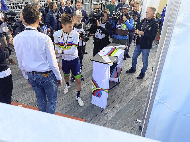 Er machte sich zur lebenden Legende: Tadej Pogačar. Hier signiert er ein WM-Trikot.