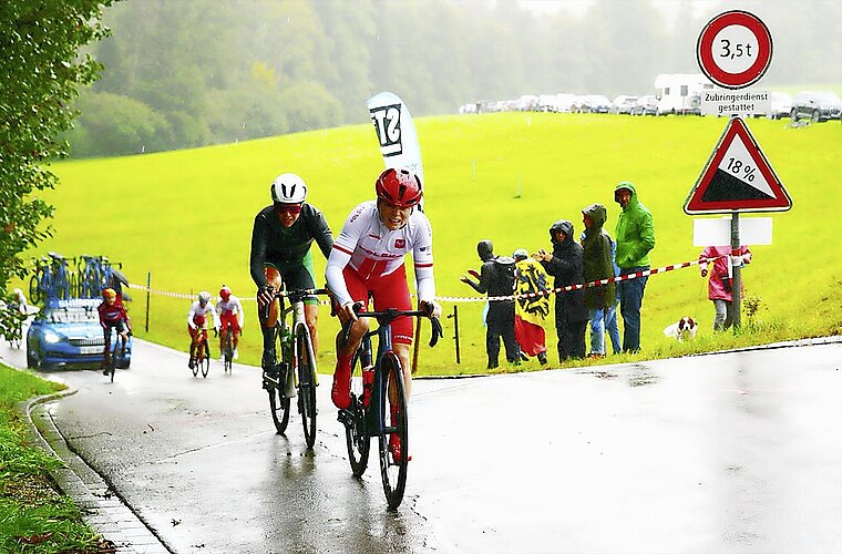 Die WM hatte nicht eben Wetterglück. Das Eliterennen der Frauen wie auch jenes der Juniorinnen fanden bei strömendem Regen statt. Das Bild zeigt den harten Aufstieg in Küsnacht.Bild Martin Bachmann