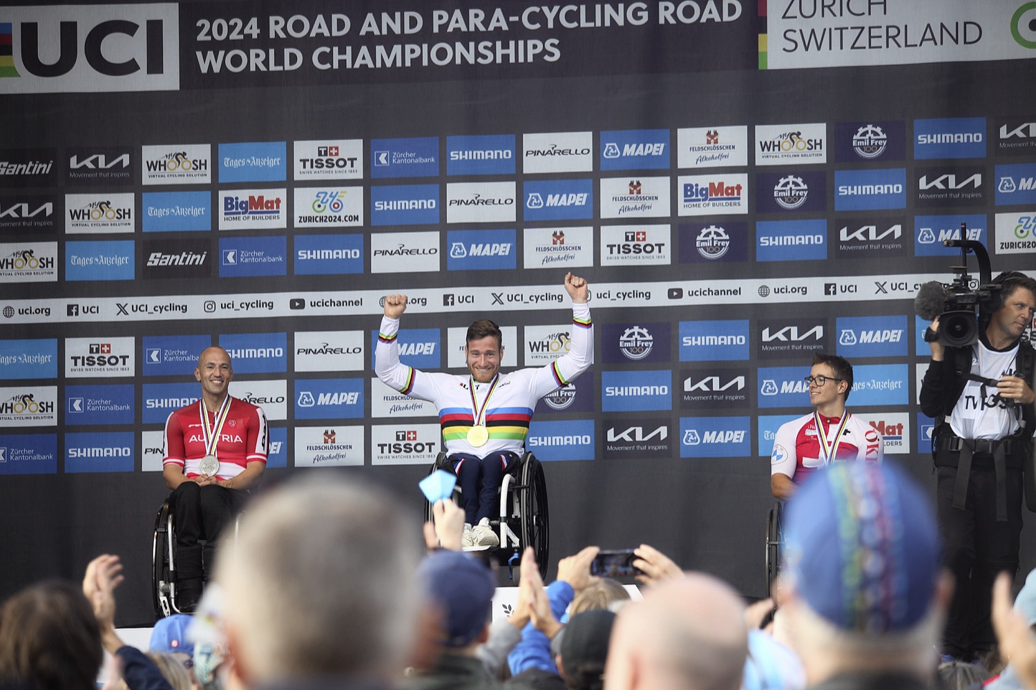 Der Handbiker Fabian Recher (rechts) holte am Sonntag Bonze. Weltmeister wurde der Franzose Joseph Frisch. Grosse Abräumerin innerhalb der Schweizer Paracycling-Delegation war Flurina Rigling: Sie holte im Zeitfahren und im Strassenrennen je die Goldmedaille.