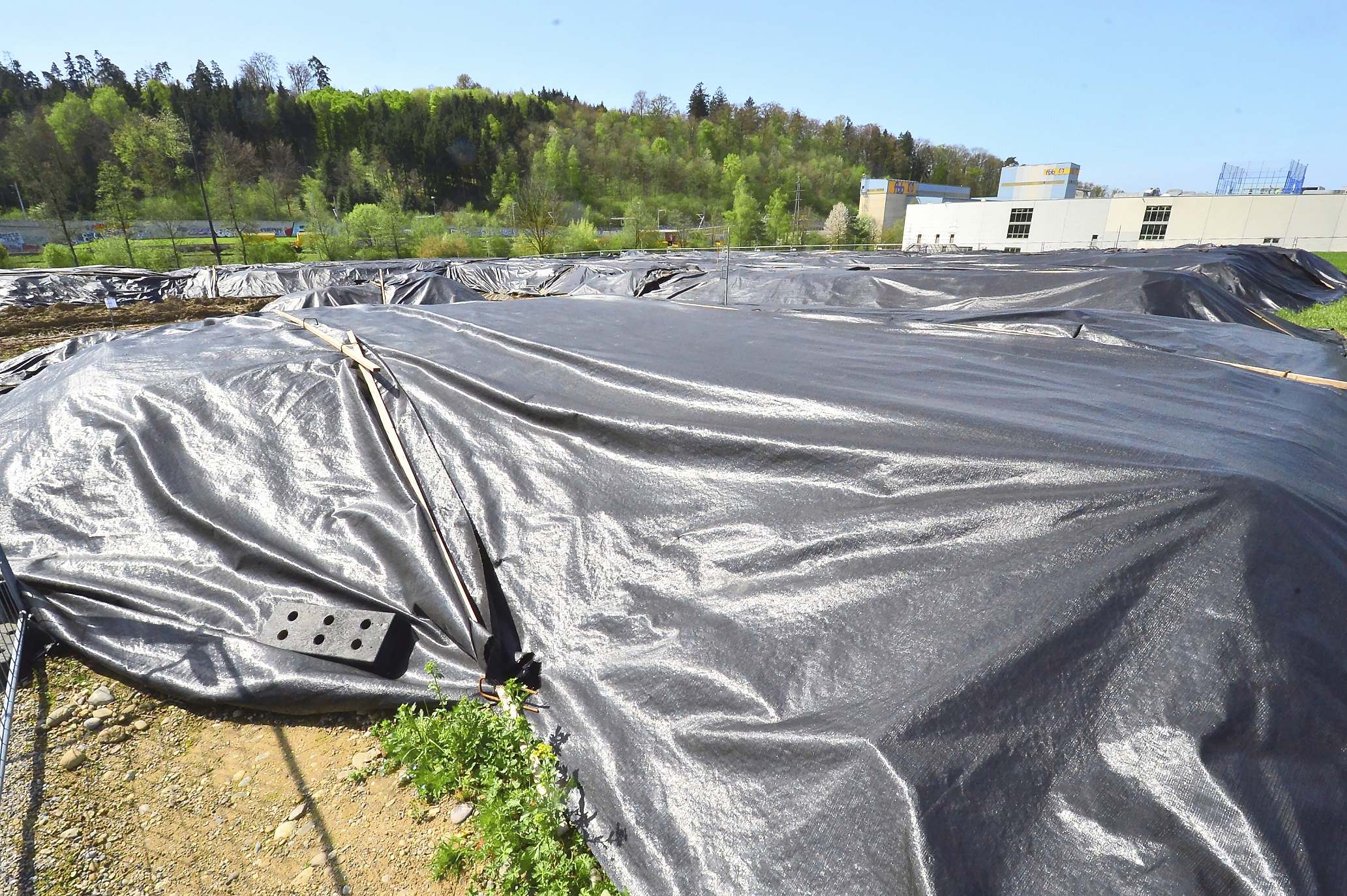 Mitten im Klotener Industriegebiet Steinacker türmen sich zahlreiche Erdhügel auf, die mit schwarzer Folie abgedeckt sind. Dabei handelt es sich um Aushubmaterial, das wegen des Japankäfers nicht aus Kloten abgeführt werden darf.