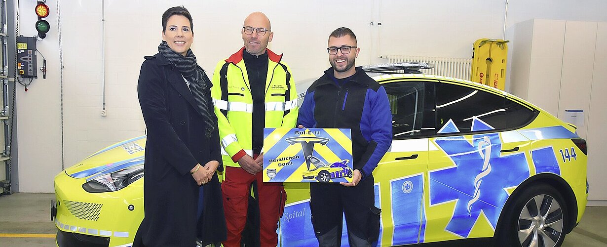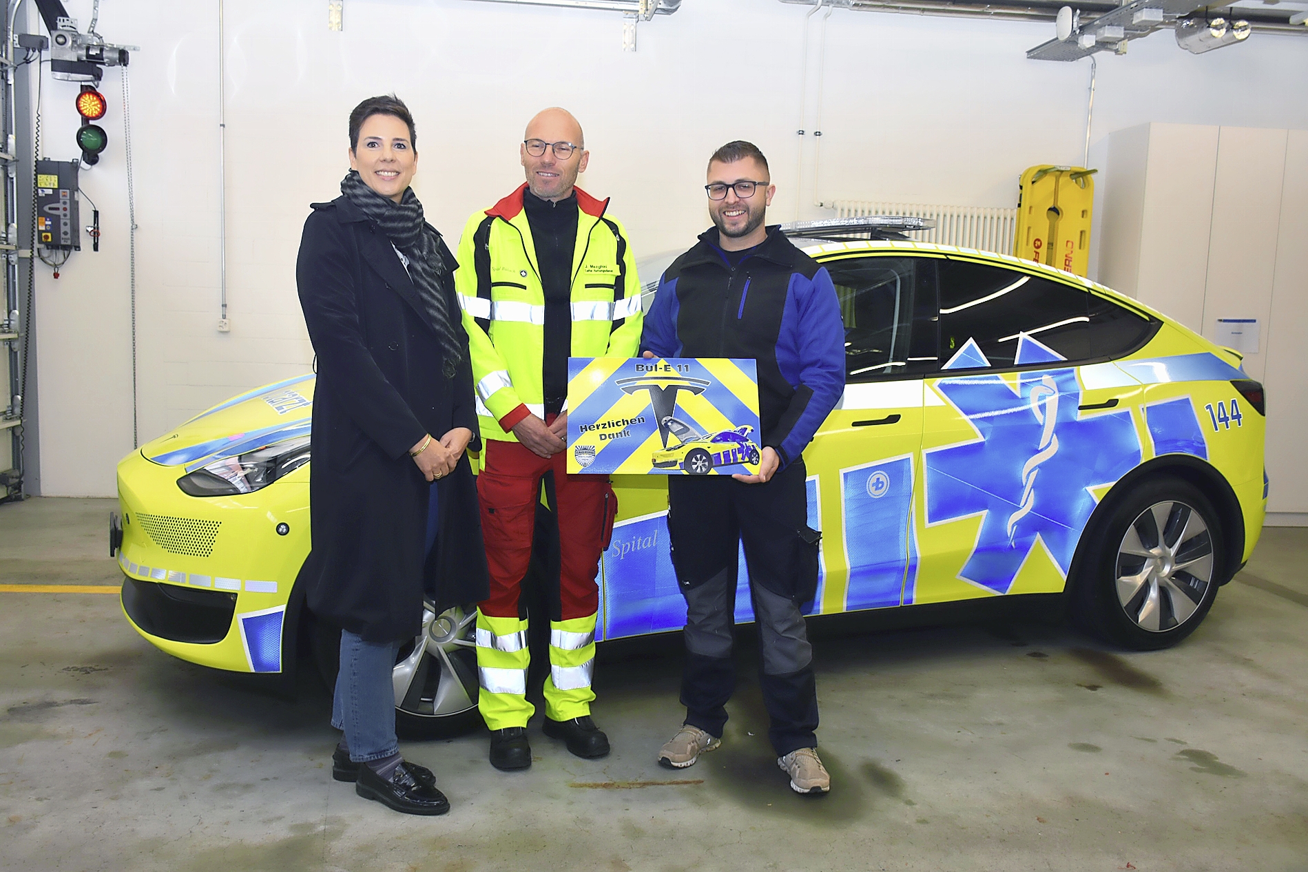 Durch den neuen Notarzt-Tesla spart das Spital jährlich rund 2500 Liter Diesel. Bei einer Reichweite von über 400 Kilometern entfallen die Tankstopps, da das Fahrzeug im Spital aufgeladen werden kann.