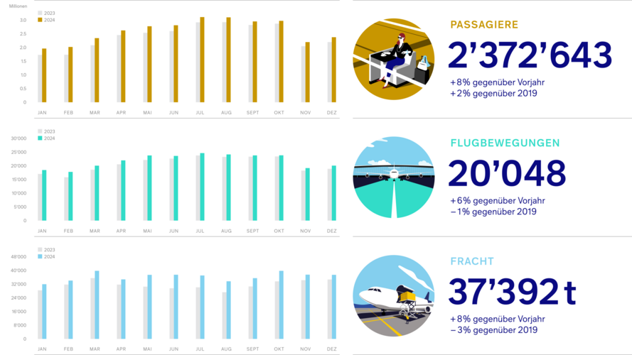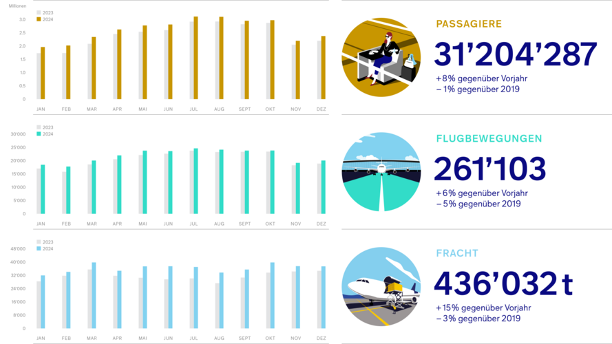 Im Jahr 2024 wurden am Flughafen Zürich rund 436 000 Tonnen Fracht abgewickelt. Gegenüber dem Vorjahr ist dies eine Zunahme von 15 Prozent. Zum Frachtumfang von 2019 ist es eine Abnahme von 3 Prozent. 2024 wurde der Flughafen durch 68 Fluggesellschaften mit 198 Städten in 74 Ländern verbunden. In Europa waren die passagierreichsten Destinationen London, Berlin und Amsterdam. (pd.)