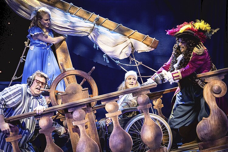 Die Komödie ist eine Spielart von Theater im Theater, und zwar von jener Art, wo die Zuschauer Zeugen einer tüchtig schiefgehenden Vorstellung werden. Sie sehen ein ehrgeiziges Ensemble am Werk, das die klassischen Abenteuer von Peter Pan und Captain Hook auf der Bühne zum Leben zu erwecken und das Publikum ins magische Nimmerland zu entführen versucht. Der Vorlage entsprechend braucht es da viel Flugkunst und Bühnenzauber, aber es hat sich sozusagen ein Kobold in Peter Pans Elfenreich und in die Bühnenmaschinerie eingeschlichen, und dort menschelt es obendrein ganz gewaltig, sodass es im Schiffsgebälk bedrohlich knarzt und sich die Requisiten verselbstständigen. So ist zu befürchten, dass es die Vorstellung gar nicht erst bis nach Nimmerland schafft. Flaschka gründete die Shake Company 1995 mit einigen Mitstreiterinnen und -streitern, um die Komödien- und Musicalszene der Deutschschweiz aufzumischen. 2002 bis 2022 leitete er das städtische Theater am Hechtplatz, eine der wichtigsten Kleinkunst-Drehscheiben der Schweiz. In diesem Jahr wird die Company also 30 Jahre alt, was sie zum Anlass nimmt, das Theater im Seefeld – den Saal der Kirchgemeinde Neumünster – für längere Zeit zu kapern und in ihm einen Meeressturm der Gags toben zu lassen. Bühnenseitig, natürlich. Der Zuschauerraum hingegen wurde, wie die Veranstalter anpreisen, zu einem «atmosphärischen Gastronomie-Theater» umgestaltet. Wo die Bewirtung hoffentlich pannenfrei ablaufen wird.