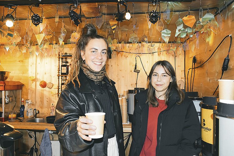 Im Sommer wurde aus dem Kalanderplatz beim Einkaufszentrum Sihlcity eine Fussball-EM-Oase – inklusive dreistöckigem Baumhaus. Für die Adventszeit hat man die Holzkonstruktion umfunktioniert. Wer während des Shoppens eine Pause braucht, ist beim Glühweinstand am richtigen Ort. Der rote Glühwein mit Amaretto kostet 6.50 Franken. Wer lieber was anderes trinkt, dem empfehlen Vicky Pühringer (links) und Kim Nievergelt den hausgemachten Orangenpunsch für 5 Franken. (pat.) Bild Pascal Turin