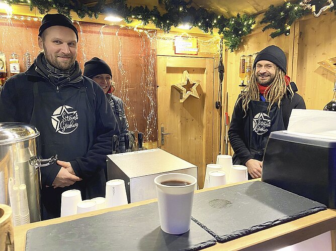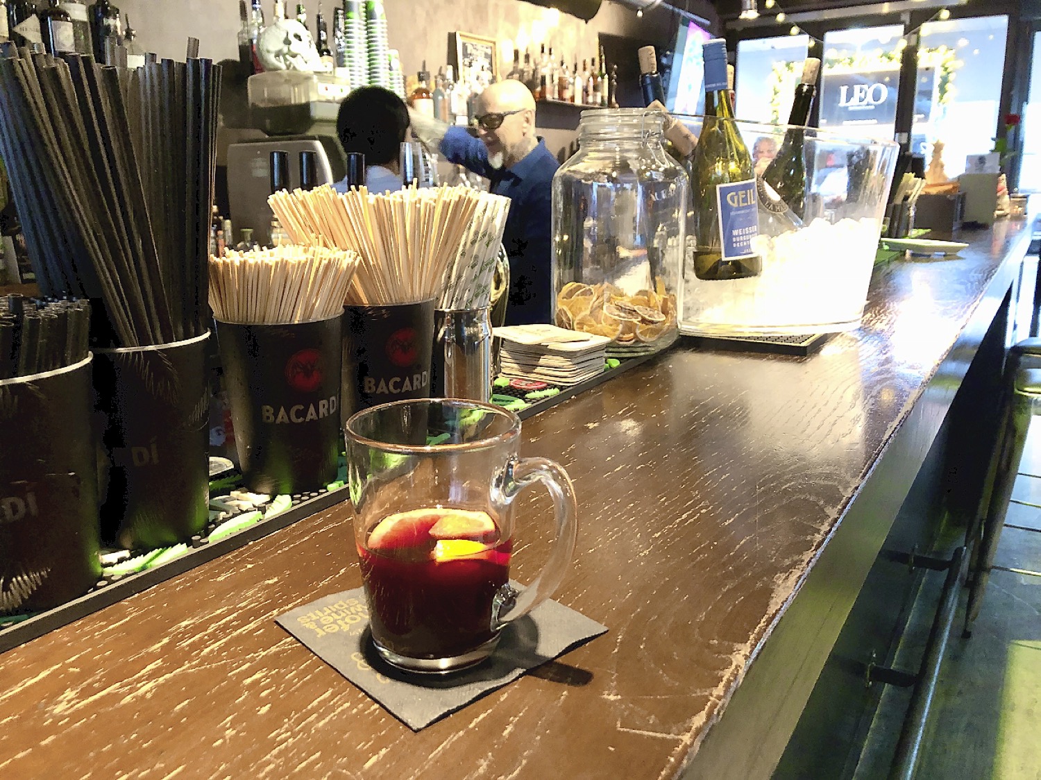 «Haus»gemachter Glühwein!! – was die Anführungszeichen wohl bedeuten mögen? Die etwas rätselhafte Affiche an der Baryton Cocktail Lounge gleich gegenüber dem Globus lockt uns hinein. Man fühlt sich schnell wohl, was nicht zuletzt am kommunikativen Inhaber Willy Boos liegt (auf dem Bild rechts im Hintergrund). Also, wieso «haus»gemacht? Boos setzt den Glühwein tatsächlich zu Hause an, wie er erzählt. Da habe er mehr Ruhe. Die Weinbasis sei Primitivo in Flaschenqualität. Dazu ein Schuss bayerischer «Hirschkuss»-Likör. Und Honig sowie die traditionellen Gewürze. Das Resultat: ein massvoll süsser, ausgewogen gewürzter Wintertrunk. Im Preis von 9.50 Franken ist unprätentiöse Gemütlichkeit inbegriffen. (toh.) Bilder Tobias Hoffmann