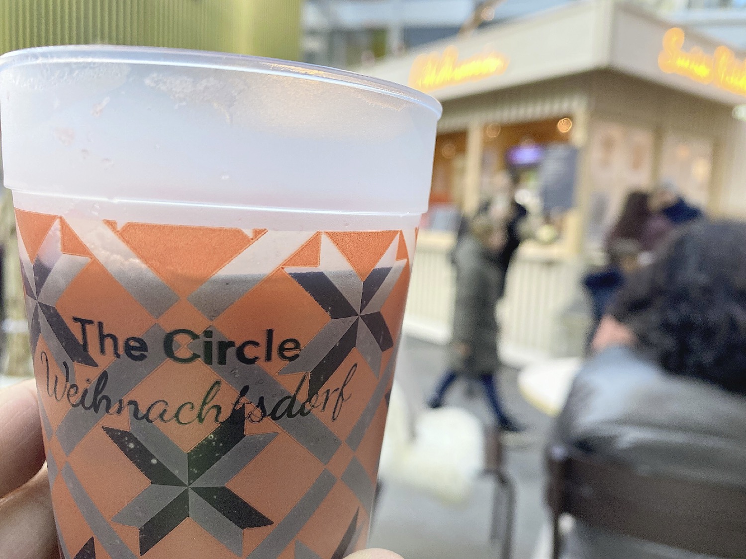 Das Weihnachtsdorf im «Circle» ist durchgestylt. Alles ist in Weiss-Beige gehalten, und ein Regendach gibt es auch. Der vom Velogast georderte alkoholfreie Glühwein ist klaglos fein, wärmt und wird in einem überraschend stilvollen Becher gereicht. Er kostet nur 6 Franken. (ls.) Bild Lorenz Steinmann
