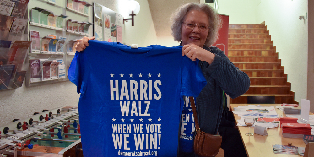 Auch Judy Brown, Kassiererin bei den Democrats Abroad Zurich, zeigte sich vorsichtig optimistisch. Sie verkaufte mit ihren Kolleginnen und Kollegen Harris-Fanartikel an einem kleinen Stand beim Eingang des GZ. Die blauen T-Shirts mit der Aufschrift «When we vote, we win!» gingen weg wie warme Weggli. Von ursprünglich 30 Stück waren schon kurz vor Mitternacht nur noch 4 übrig.