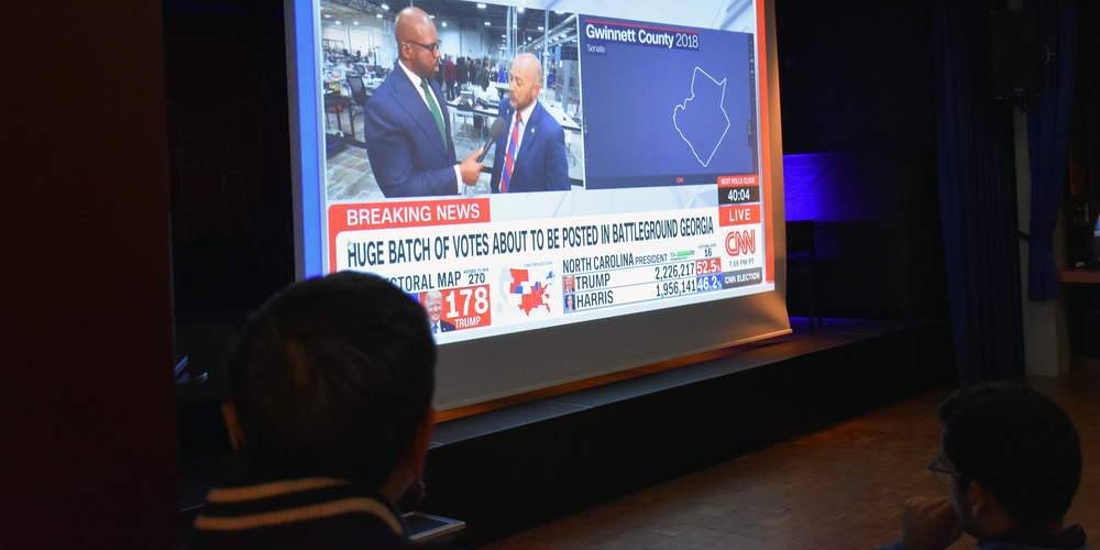 Auf die Resultate dieser «Battleground States» wartete das Publikum sehnlichst. Während die News-Moderatoren immer wieder neue vorläufige Zahlen verkündeten, machte sich die Müdigkeit bei den Anwesenden immer mehr bemerkbar. Kein Wunder: Mittlerweile war es fast 4 Uhr morgens. Viele starrten darum stumm auf eine der drei Leinwände in unterschiedlichen Räumen im GZ, auf denen «Sky News», «NBC News» oder «CNN» gezeigt wurde – je nach Gusto.